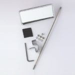 Der Spiegelkopf ist in der Höhe einstellbar. Der Spiegelkopf ist dabei leicht nach vorne geneigt und hat eine Größe von ca. 10,5 cm x 4,5 cm. Der Lochabstand beträgt ca. 3,5 cm.